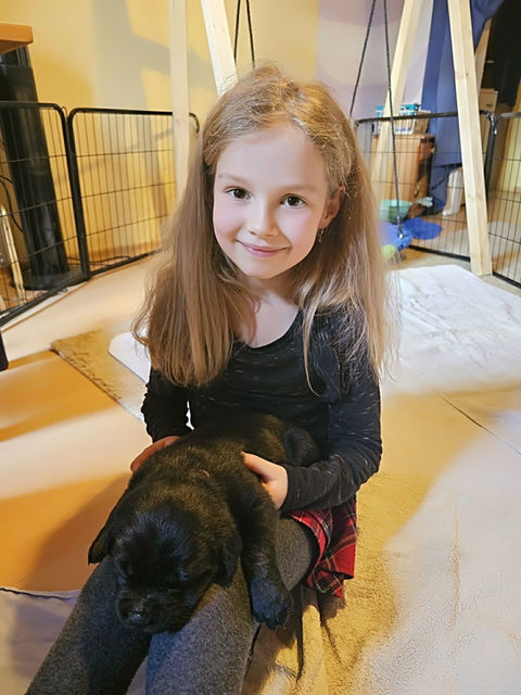 Einen vor kurzem zurück gekauften Welpen haben wir in eine dankbare Familie gegeben, wo auch schon eine 2 jah alte Hündin von uns, ungeduldig auf sie gewartet hat und nach 10 Min waren es Schwestern